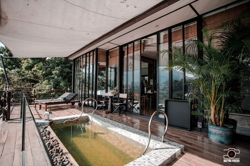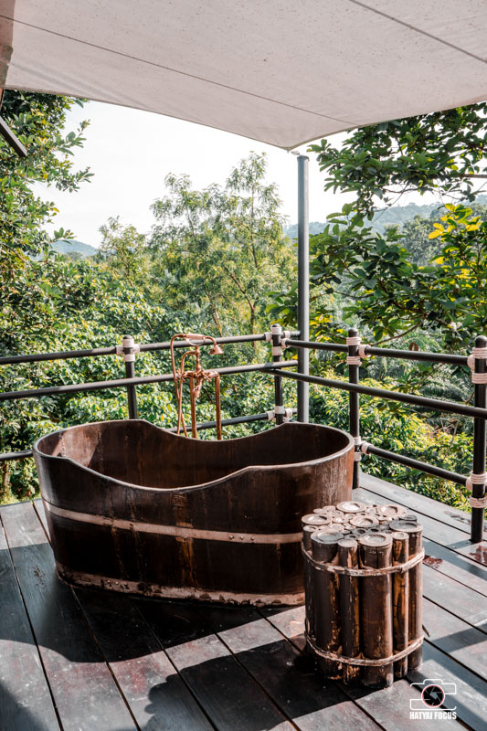 ข้างนอกยังมีอ่างอาบน้ำไม้นั่งแช่แบบชิลล์ ๆ แลวิวเขา ได้ฟิลสุด ๆ