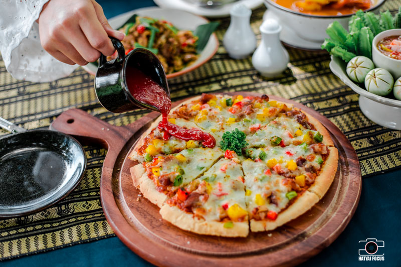 ปกติเราจะทานพิซซ่ากับซอสใช่ไหม แต่ที่นี่เขาเสิร์ฟเป็นซอสส้มเจืองนะ แปลกใหม่แต่อร่อยมาก