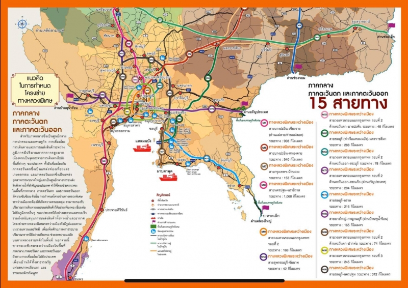 ภาคกลางและตะวันออกเนื่องจากภาคกลางเป็นแหล่งเศรษฐกิจสำคัญของประเทศพร้อมกับเชื่อมโยงระหว่าง กรุงเทพ-EEC ,พม่า-กัมพูชา และภูมิภาคอื่นๆ เลยจะมีเส้นทางมากกว่าภาคอื่น เริ่มต้นจากสาย M5 เป็นสายหลักซึ่งเชื่อมระหว่างภาคกลางไปภาคเหนือ ออกประเทศลาวเชื่อมต่อจีนตอนใต้ สาย M6 บางปะอิน-หนองคาย ซึ่งได้เริ่มสร้างไปแล้ว คือสายกรุงเทพ-โคราช สาย M7 กรุงเทพ-บ้านฉาง หรือมอเตอร์เวย์ กรุงเทพชลบุรี ที่เราใช้กันอยู่ จะเปิดครบสายตามแผน ในกลางปีหน้า ซึ่งเป็นสายเดียวของแผนที่เสร็จครบเต็มสาย