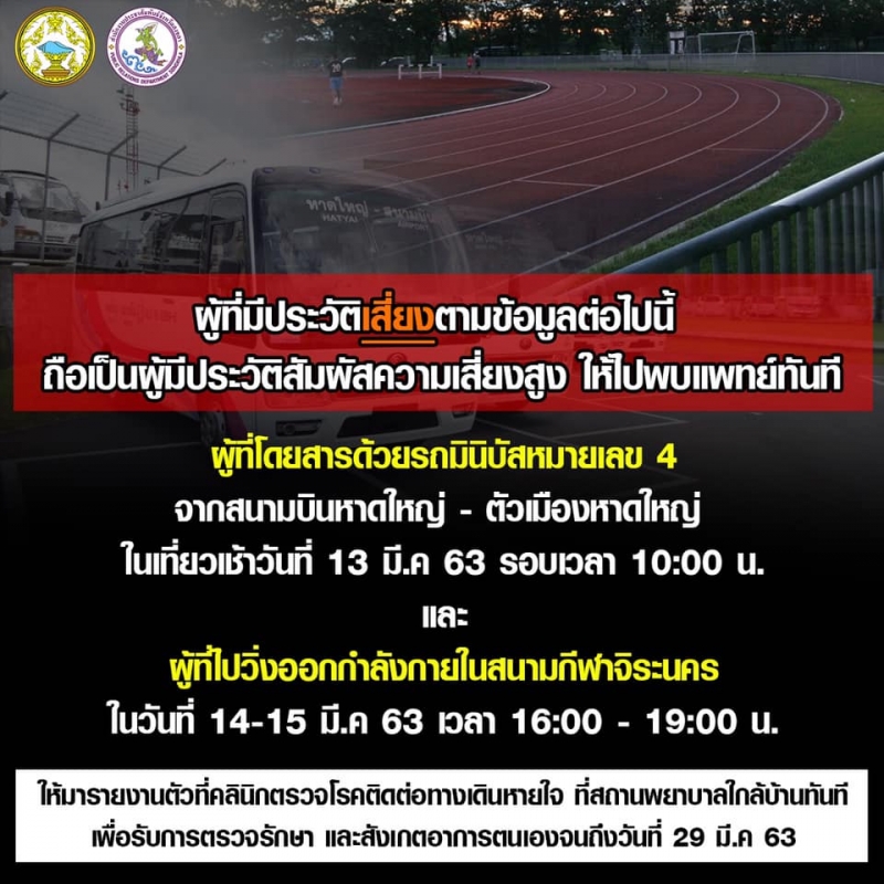 วันนนี้(20/3/63) สำนักงานสาธารณสุขจังหวัดสงขลา แจ้งด่วน ผู้ที่โดยสารด้วยรถมินิบัส หมายเลข 4 เส้นทางสนามบินหาดใหญ่ – ตัวเมืองหาดใหญ่ ในเที่ยวเช้าวันศุกร์ ที่ 13 มีนาคม 2563 รอบเวลา 10.00 น. และ ผู้ที่ไปวิ่งออกกำลังกาย ณ สนามกีฬาจิระนคร อำเภอหาดใหญ่ จังหวัดสงขลา ในวันที่ 14-15 มีนาคม 2563 ตั้งแต่เวลา 16.00 น.-19.00 น. ถือว่าเป็นผู้มีประวัติสัมผัสความเสี่ยงสูง ให้รีบมารายงานตัวที่คลีนิคตรวจโรคติดต่อทางเดินหายใจ ณ สถานพยาบาลใกล้บ้านทันที เพื่อรับการตรวจรักษาและสังเกตอาการตนเองจนถึงวันที่ 29 มีนาคม 2563 แต่หากผู้ที่ไปวิ่งคนเดียว ณ สนามกีฬาจิระนคร โดยไม่ได้พูดคุยหรือสัมผัสกับบุคคลอื่นในระยะใกล้ชิด ถือว่าไม่เป็นผู้ที่มีประวัติความเสี่ยงและไม่ต้องเข้าพบแพทย์