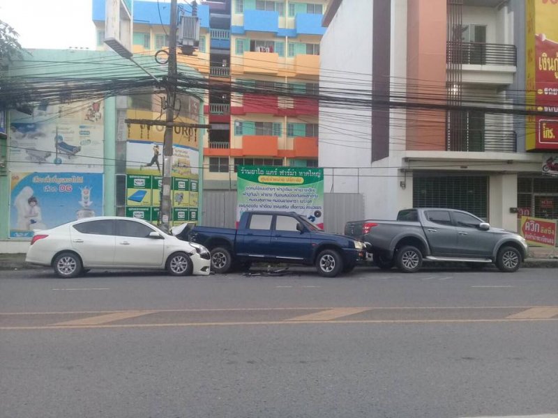 เจ้าหน้าที่จึงลงพื้นที่เข้าตรวจสอบอุบัติเหตุรถชน ระหว่างรถยนต์เก๋งสีขาว รถกระบะสีน้ำเงินจอดอยู่ข้างทางบริเวณที่เกิดเหตุได้รับความเสียหาย 3 คันรวด