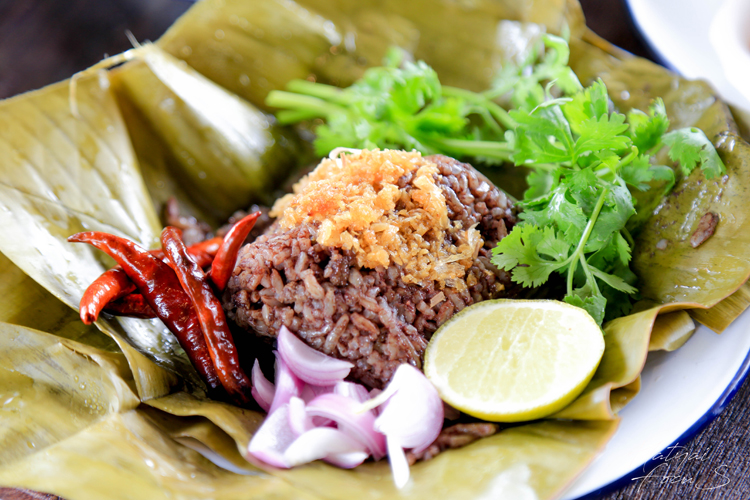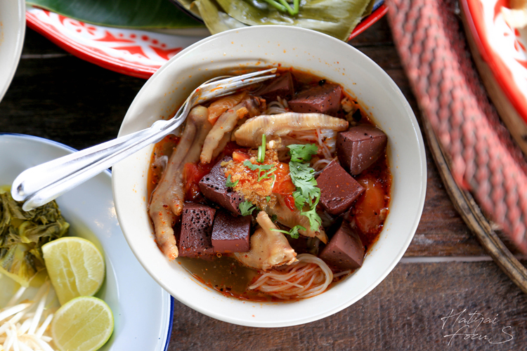 เมนูของคาวอย่างสุดท้าย ที่แปลกใหม่มาก ก็คือ ข้าวกั้นจิ้น ข้าวที่คลุกกับเลือดและเครื่องปรุงรส นำไปห่อใบตอง แล้วนึ่งจนได้ที่ ทานคู่กับผักชี แตงกวา และเพิ่มความจัดจ้านด้วยพริกแห้งคั่ว