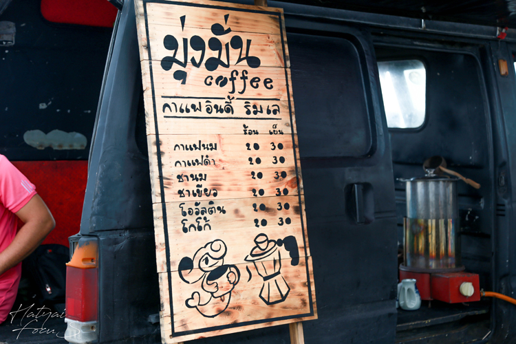 วันนี้เราไปถึงร้านตอนเกือบจะ 10 โมงแล้ว แม้อากาศจะครึ้มฟ้าครึ้มฝน แต่ก็ยังรู้สึกร้อนและกระหายเครื่องดื่มเย็น ๆ ก็เลยสั่งกาแฟเย็น เห็นครั้งแรกคือตกใจมาก มาเป็นถัง ในราคา 30 บาท แถมแต่ละถังมีสติกเกอร์คำคมต่าง ๆ ด้วยนะ ใครจะได้ประโยคอะไร ก็ต้องลุ้นกันเอาเอง