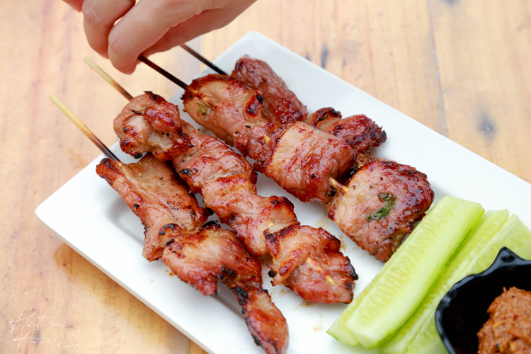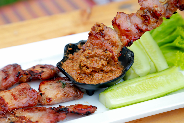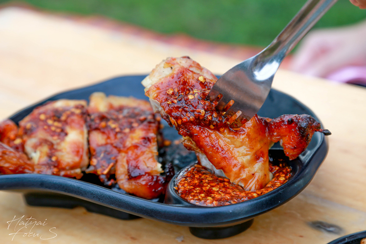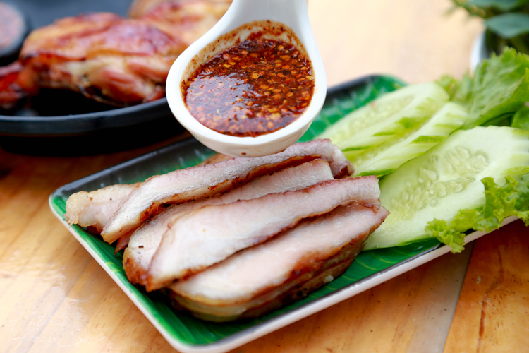แน่นอนอยู่แล้วว่าอีกเมนูที่ขาดไม่ได้ต้องเป็น “ไก่ย่าง” 50 บาท และ “คอหมูย่าง” 80 บาท