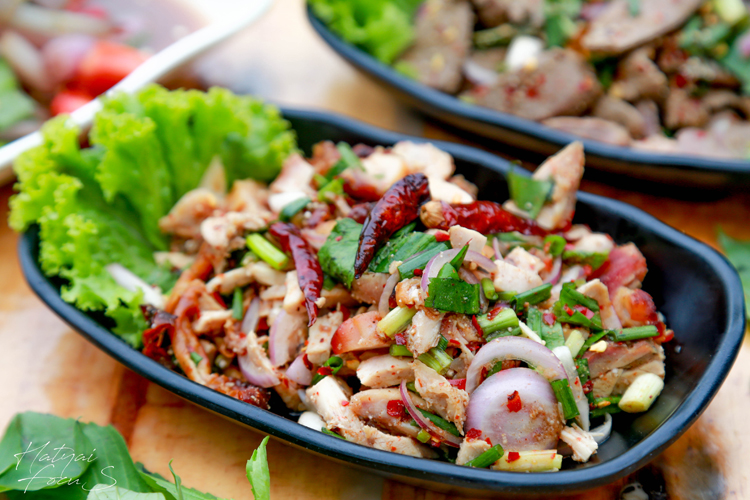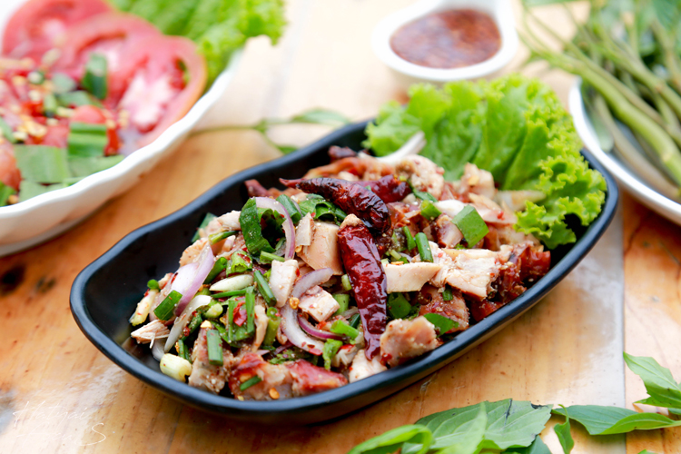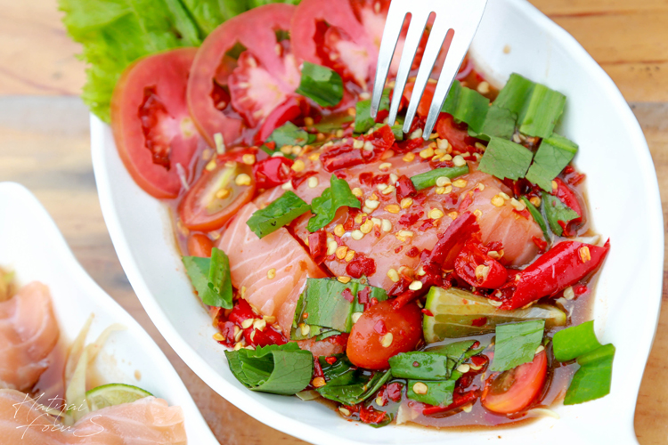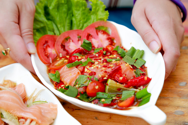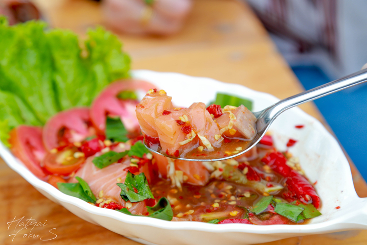 แซลมอนในขนาดพอดีคำหันชิ้น ๆ ยำกับน้ำปลาร้าหอม ๆ แต่ถ้าใครเลือกยำแบบไม่ใส่น้ำปลาร้าก็สามารถแจ้งทางร้านได้เลยนะ