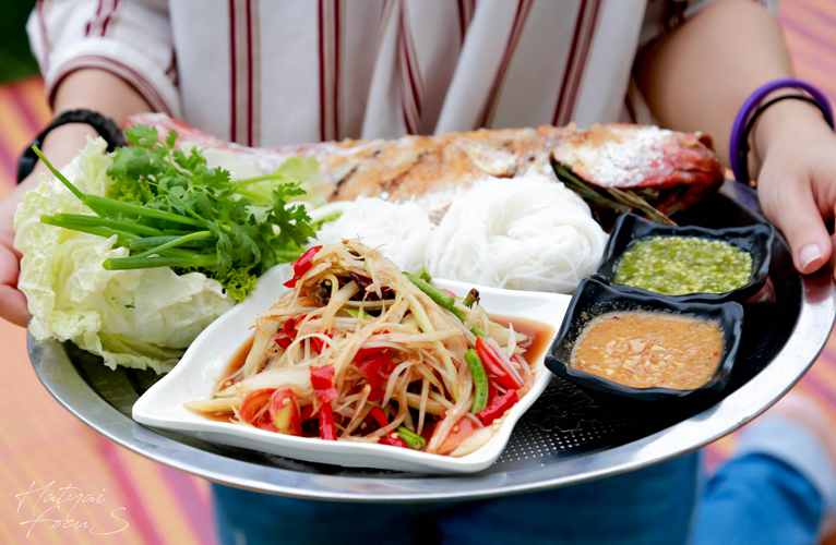 ไปกันที่ส้มตำกันบ้าง เมนูที่เราสั่ง “ตำถาดเมี่ยงปลาเผา” ราคา 200 บาท ปลาทับทิมตัวใหญ่ เนื้อแน่น สด เผามาแบบร้อน ๆ เสิร์ฟพร้อมกับตำไทย หรือถ้าใครชอบกินปลาร้าก็สามารถเปลี่ยนเป็นตำปลาร้าได้เด้อ