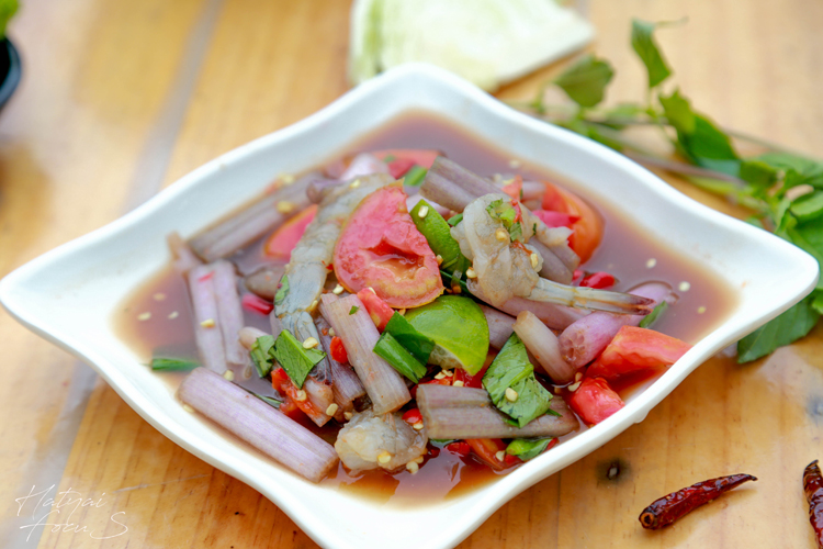 “ตำไหลบัว (ปลาร้า)” ราคา 60 บาท ไหลบัวตำใส่น้ำปลาร้าและกุ้งสด อร่อย