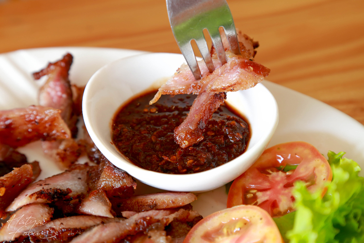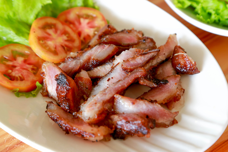 ไปต่อกันที่เมนู คอหมูย่าง เสิร์ฟแบบร้อน ๆ เป็นเนื้อหมูติดมันนิด ๆ พอให้เคี้ยวแบบหนุบหนับ จิ้มกับน้ำจิ้มสูตรเด็ดของทางร้าน หอมพริกคั่ว หวานอมเปรี้ยว