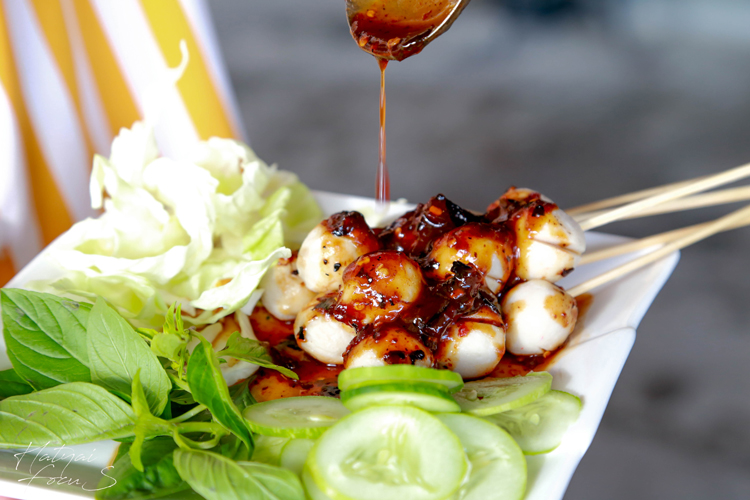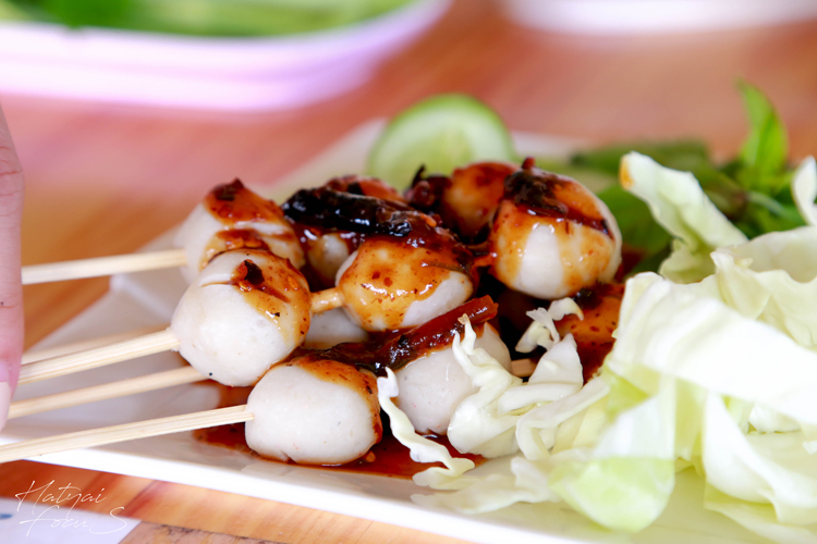ปิดท้ายด้วย ลูกชิ้นปลาย่าง น้ำจิ้มพริกคั่วรสเด็ด+เครื่องเคียงผักสด ใคร ๆ ที่ได้ชิมก็มักจะชอบเมนูนี้ ลูกชิ้นปลาเด้ง อร่อยถึงรสชาติปลาเน้น ๆ ราดด้วยน้ำจิ้มพริกคั่วสูตรเฉพาะ หอมพริกคั่ว หวาน ๆ ยิ่งกินยิ่งเพลิน หิว ๆ แบบนี้ได้ลูกชิ้นซัก 1- 2 ไม้ กำลังดีเลย แล้วค่อยไปกินเป็ดย่าง กินส้มตำต่อ