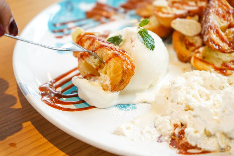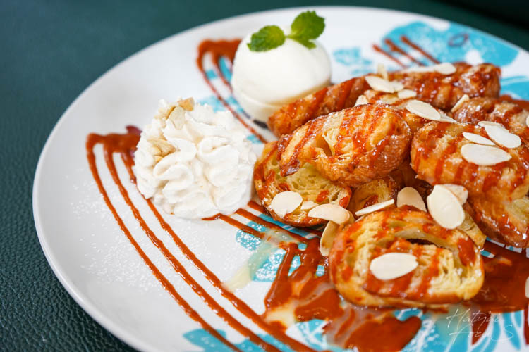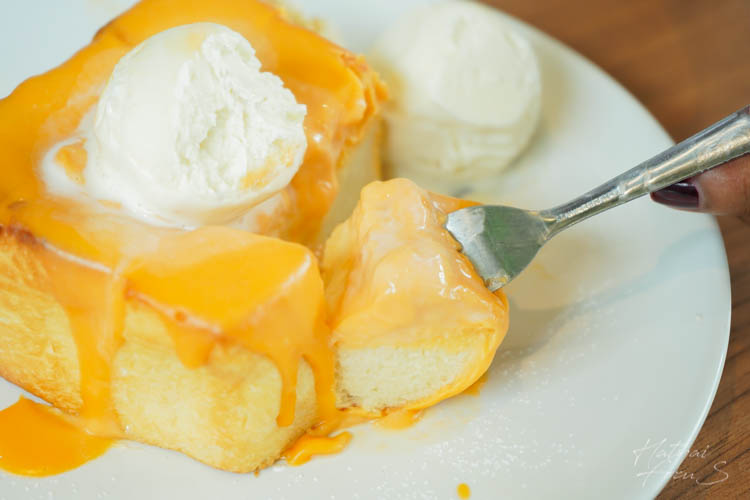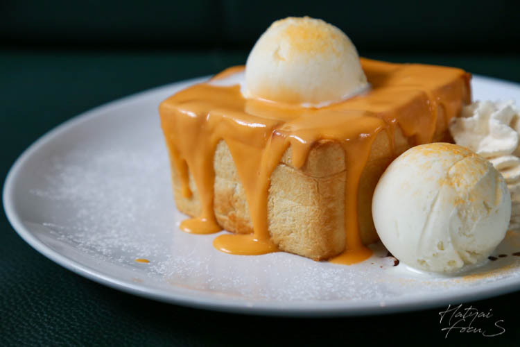ฮันนี่โทสไข่เค็ม ซอสไข่เค็มราดบนโทสร้อน ๆ บวกกับไอศกรีมวนิลา บอกเลยว่าแอดฟินมาก ๆ