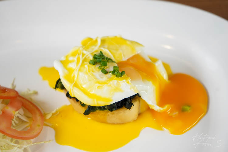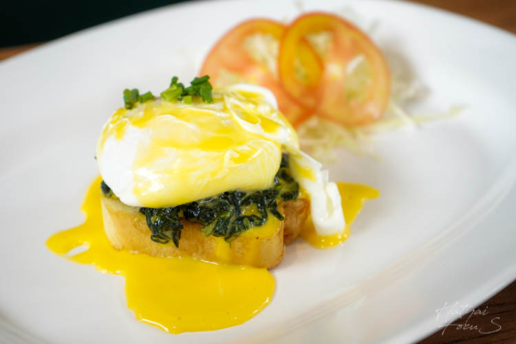 เริ่มกันที่เมนูแรกของเรา คือเมนูอาหารเช้า เอ็กเบนผักโขมไข่ลวกพร้อมขนมปัง มีน้ำซอสราด