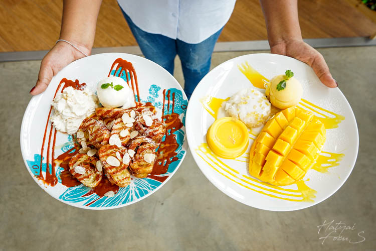โรตีฝรั่งเศส มีโรตีสับเสิร์ฟพร้อมวิปปิ้ง กินคู่กับไอศกรีมวนิลา (สามารถเลือกรสชาติได้) ราดด้วยซอสชาไทย