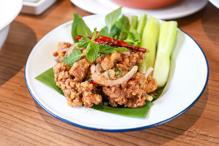 เป็ดชุบแป้งทอดแล้วจึงนำมาทำเป็นลาบ ราคาอยู่ที่จานละ 100 บาท