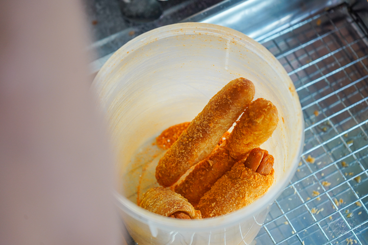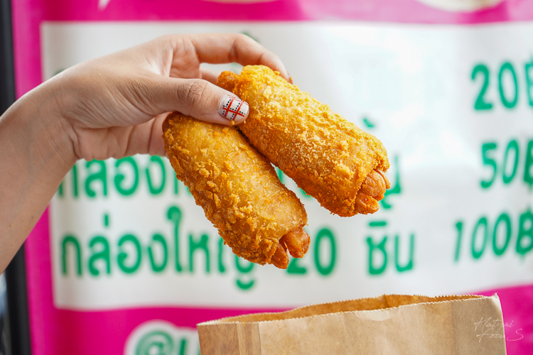 นำแป้งมาห่อไส้กรอก คลุกเกร็ดขนมปังแล้วนำไปทอด