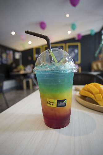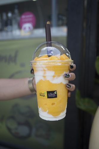 แก้วนี้ เป็นน้ำ “Mango Smoothies with Yogurt” น้ำมะม่วงสลับกับโยเกิร์ต ท็อปด้วยมะม่วงสุกหั่นเต๋าอัดเต็มแก้ว เอาใจคนรักมะม่วงจริง ๆ และยังมีเครื่องดื่มอื่น ๆ อีกหลากหลายเมนู ไม่ว่าจะเป็น กาแฟสด, ชาเขียว, ชานม, น้ำผลไม้ปั่น