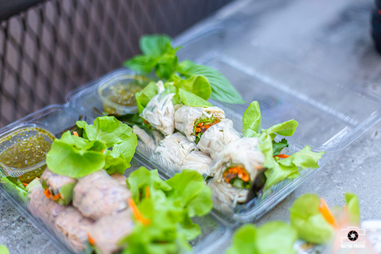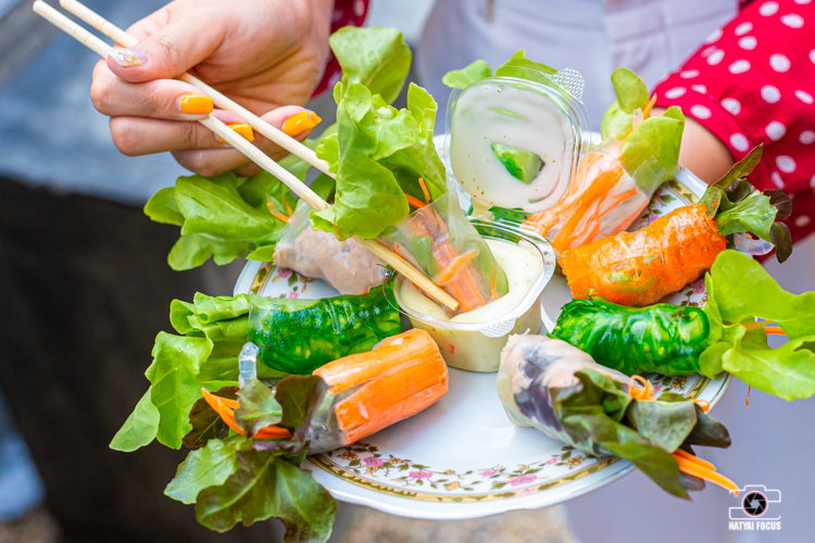 หน้าตาอาจจะเหมือนสลัดโรล แต่ขอบอกเลยนะจ๊ะว่าแตกต่างกันเลยละ เพราะสลัดโรลจะหั่น 2 คำ ใส่ผักสลัดทั่ว ๆ ไป แต่ก๋วยเตี๋ยวลุยสวนจะหั่นแบบพอดีคำ ใส่ผักสลัด + เครื่องเทศไทย เช่น ผักชีฝรั่ง (ปักชีใบเลื่อย) + โหรพา