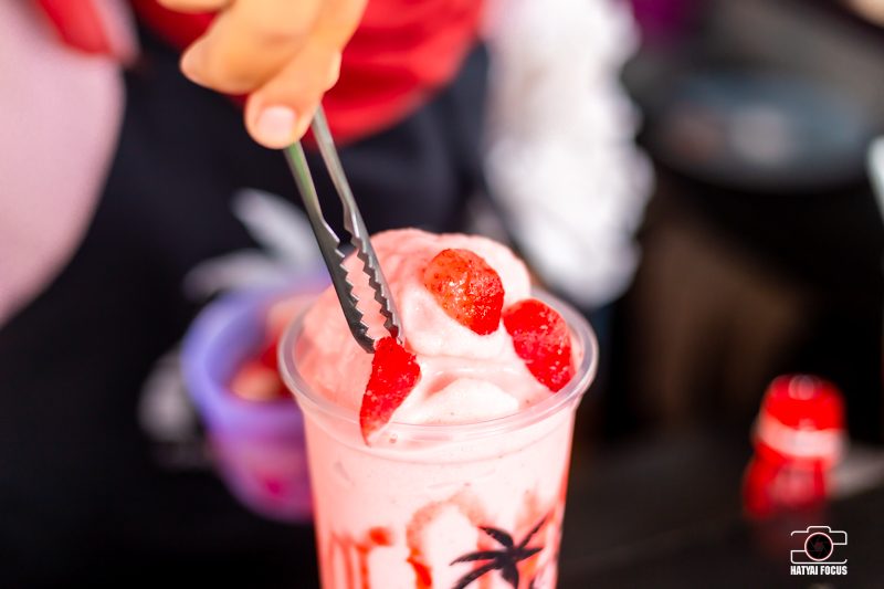 เพิ่มความฟินไปอีกด้วยท็อปปิ้งสตอเบอรี่สด ๆ บอกเลยว่าเมนูนี้เด็ดมาก