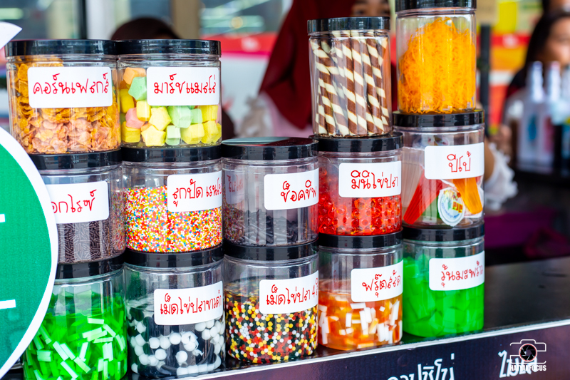 ในส่วนของท็อปปิ้งมีให้เลือกหลากหลายอย่างเลยนะทั้ง มาร์แมลโล่ ช็อคชิพ ปีโป้ คอร์นเฟลกส์ เป็นต้น ใครชอบแบบไหนก็สั่งได้เลยนะ (เพิ่มท็อปปิ้ง 1-2 อย่างฟรี! นะจ๊ะ) เพิ่มวิปครีม +5 บาท ฝอยทอง +5 บาท
