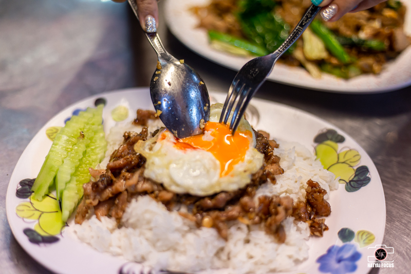 ราดหน้าเส้นหมี่กรอบ เรียกว่าทอดเส้นกันไม่หยุดเลยทีเดียว จานนี้น้องอุ๋งสั่งเป็นราดหน้าหมูเส้นหมี่กรอบ เสิร์ฟแบบร้อน ๆ น่ากินมาก ๆ ธรรมดา 45 บาท ใส่ไข่ 55 บาท