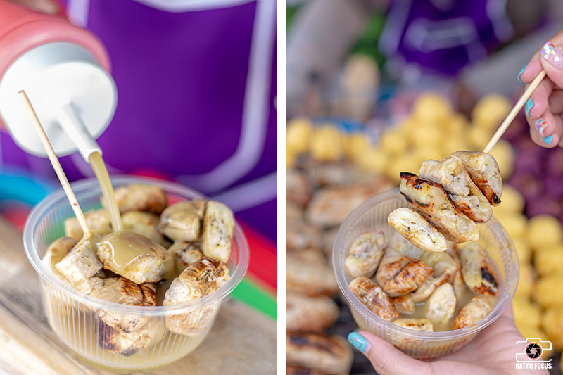 ส่วน กล้วยปิ้ง ก็ขายดีไม่แพ้กัน กล้วยห่าม ๆ แต่ไม่ถึงกับห่ามมากน้าาา ยังคงมีความหวานจากกล้วยไม่น้อย ทางร้านปิ้งไฟอ่อน ๆ ทั้งลูกแบบนี้ นำมาทับ และตัดเป็นชิ้น ๆ เล็ก ๆ แบบพอดีคำ