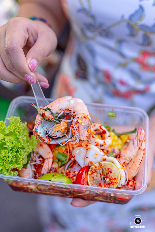เมนูแรกที่น้องอุ๋งสั่งเป็นยำทะเลรวม บอกเลยว่าเครื่องแน่นจุก ๆ ทั้งกุ้ง หอย และปลาหมึก
