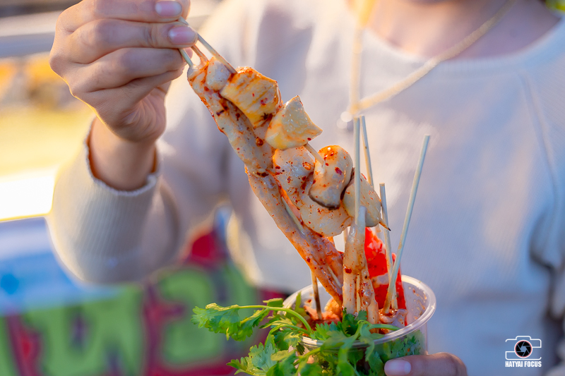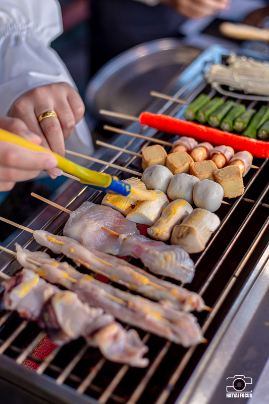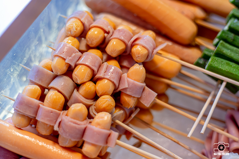 ภายในร้านมีให้เลือกมากกว่า 20 อย่างด้วยกัน ไม่ว่าจะเป็นเบคอน ลูกชิ้น ปลาหมึก ไส้กรอก เต้าหู้ เห็ด หอย และอีกเพียบ ทุกไม้ราคาเดียวคือ 10 บาทเท่านั้น พิเศษ!! เมื่อเพื่อน ๆ ซื้อครบ 10 ไม้ รับฟรี 1 ไม้ไปเลย