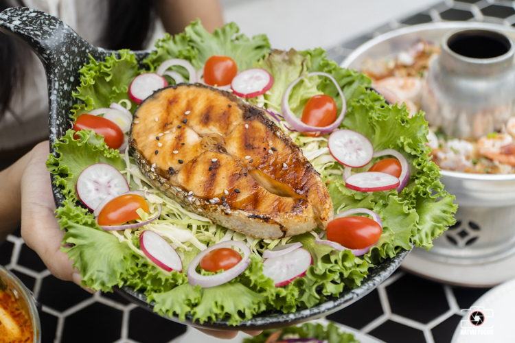 ต่อด้วยสลัดแซลมอน ชิ้นโต ๆ หนังกรอบเนื้อนุ่มชุ่มฉ่ำ มาพร้อมกับผักสดออร์แกนิค เมนูนี้ได้ทั้งความอร่อย และสุขภาพจ้าาาา