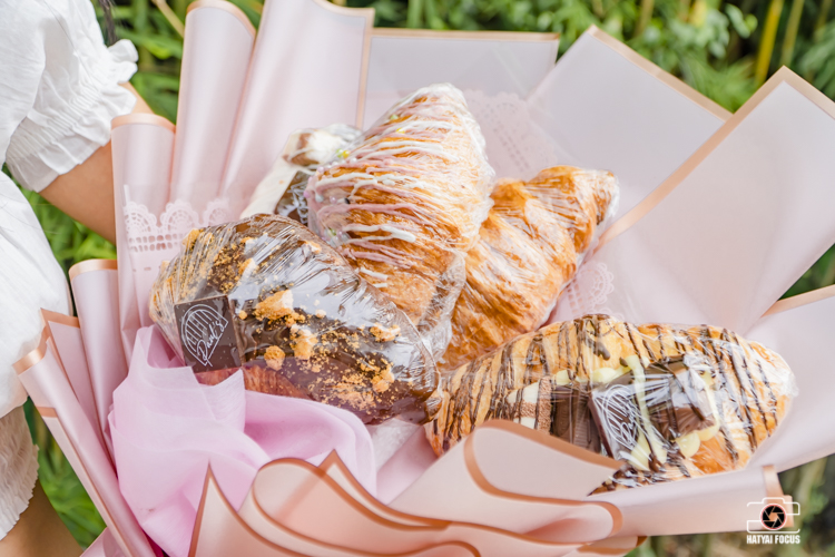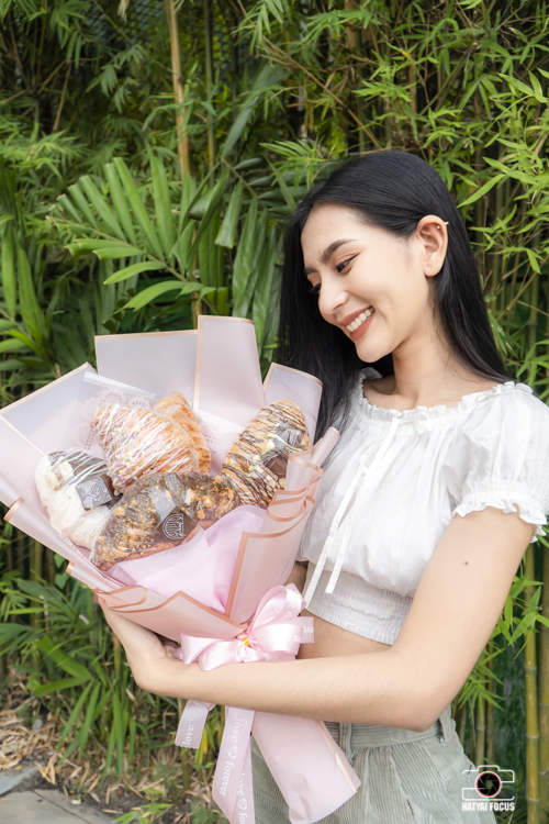 และวันนี้เจ้ขอประเดิมด้วยช่อครัวซองต์กันก่อน เนื่องจากพรุ่งนี้เป็นวันวาเลนไทน์แล้ว เพื่อน ๆ หลายคนอาจกำลังมองหาของขวัญเก๋ ๆ ให้คนพิเศษอยู่หรือเปล่า เราขอแนะนำ Croissants bouquet ช่อครัวซองต์หวานล้น ๆ ช่อใหญ่แบบนี้ ราคาเพียง 750 บาทเท่านั้น ทั้งสวย น่ากิน โอ้ยยยย บอกเลยโดนใจสาวกคนรักครัวซองต์แน่นอน