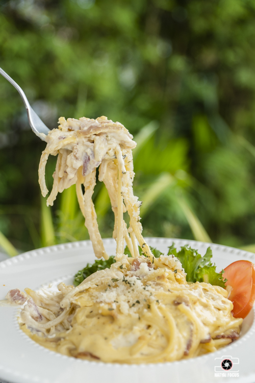 หรือจะเป็นด้านอาหารคาวที่นี่ก็มีครบจบเลยนะจ๊ะ จัดต่อด้วยสปาเก็ตตี้คาโบนาร่า ผัดกับซอสครีมห๊อมหอมสูตรของทางร้าน ตัวเส้นเหนียวนุ่มกำลังดี ใครที่ชอบกินสปาเก็ตตี้ต้องแวะมาลอง จานนี้ราคาเพียง 120 บาท