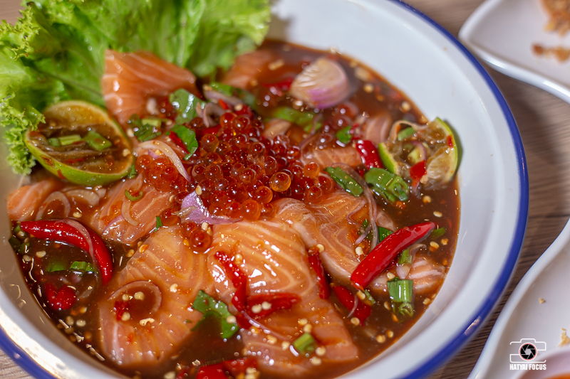 หรือใครสาวกปลาแซลมอนก็พลาดไม่ได้เชียวล่ะ กับเมนูยำแซลมอนปลาร้า แซลมอนเนื้อสด หวานฉ่ำ คลุกในน้ำยำปลาร้านัว ๆ ท็อปด้วยไข่ปลากรุบกรอบ จานนี้อร่อยมากกกกก