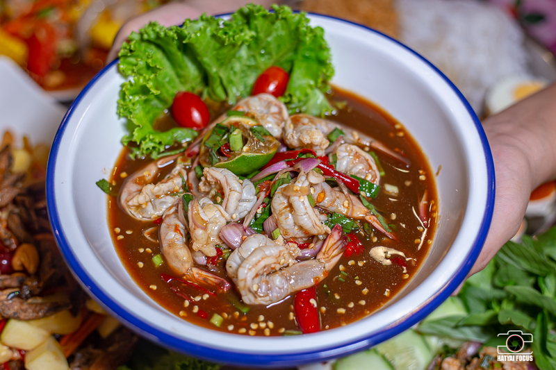 ยำกุ้งสะดุ้งปลาร้า แค่เห็นก็น้ำไหลสอแล้ว กุ้งส๊ดสดสะดุ้งน้ำร้อนพอสุก นำมายำในน้ำปลาร้าสูตรของทางร้าน รสชาติเผ็ด เปรี้ยว แซ่บเวอร์