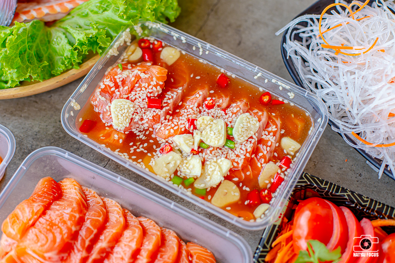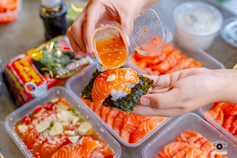 นอกจากเนื้อปลาสด ๆ ที่ทางร้านแล่ให้แล้ว ยังมีปลาแซลมอนดอง ในเซตนี้ด้วย กลิ่นหอมยั่วใจมากกกก ปลาเนื้อฉ่ำ ๆ นำไปดองซีอี้วสูตรของทางร้าน ห่อด้วยสาหร่าย ข้าว และน้ำจิ้มซีฟู้ด บอกเลยว่าแซ่บ เด็ด หรอยมากกกก