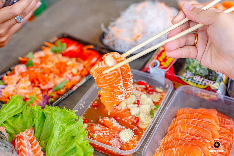 หรือจะเป็นยำแซลมอน หั่นเป็นลูกเต๋าโรยหน้าด้วยไข่กุ้ง เสิร์ฟพร้อมกับน้ำยำสูตรเด็ดของทางร้าน รสชาติแซ่บ ใช้น้ำมะนาวแท้เติมด้วยน้ำปลาร้า ใส่วาซาบิแท้ลงไปนิดหน่อย ให้มีรสชาติเผ็ดจี๊ดจ๊าด คลุกเคล้าให้เข้ากัน บอกเลยว่าฟินมากค่ะแม่!!!!!!!!!!