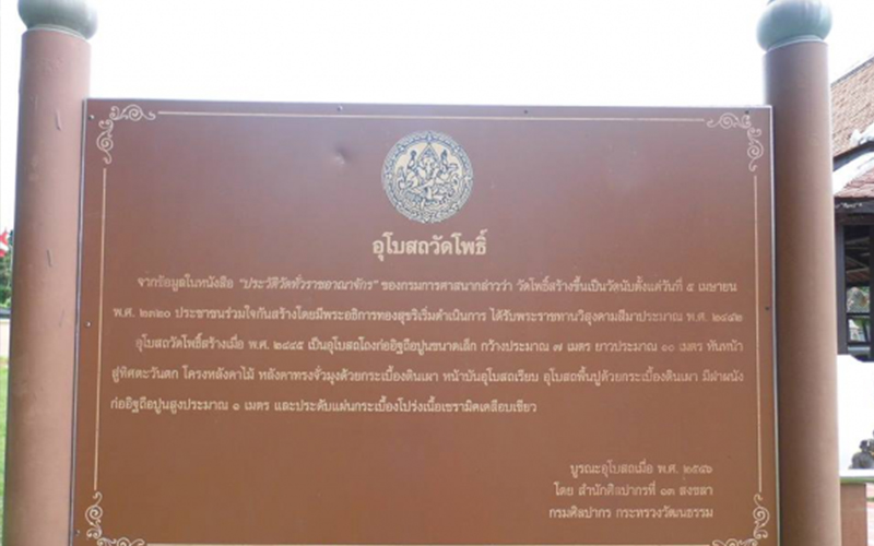 พื้นที่ตั้งวัดเป็นที่ราบลุ่ม มักถูกน้ำท่วมในฤดูฝน อาคารเสนาสนะต่างๆ มีอุโบสถ กว้าง 8 เมตร ยาว 10 เมตร สร้างเมื่อ พ.ศ. 2445 โครงสร้างพื้นปูด้วยอิฐหน้าวัว ไม่มีฝา ผนังกั้น ศาลาการเปรียญ กว้าง 12 เมตร ยาว 27 เมตร สร้างเมื่อ พ.ศ. 2506 โครงสร้างฝาใช้อิฐโปร่ง กุฏิมี จำนวน 5 หลัง โครงสร้างเป็นอาคารไม้ และครึ่งตึกไม้ สำหรับปูชนียวัตถุบรรจุ อัฐิ พระอธิการทองสุข อดีตเจ้าอาวาส วัดโพธิ์ วัดโพธิ์สร้างขึ้นเป็นวัด นับตั้งแต่ วันที่ 5 เมษายน พ.ศ. 2320 ประชาชนร่วมใจกัน สร้างโดยพระอธิการ ทองสุข ริเริ่มดำเนินการ ได้รับวิสุงคามสีมาประมาณ พ.ศ. 2442