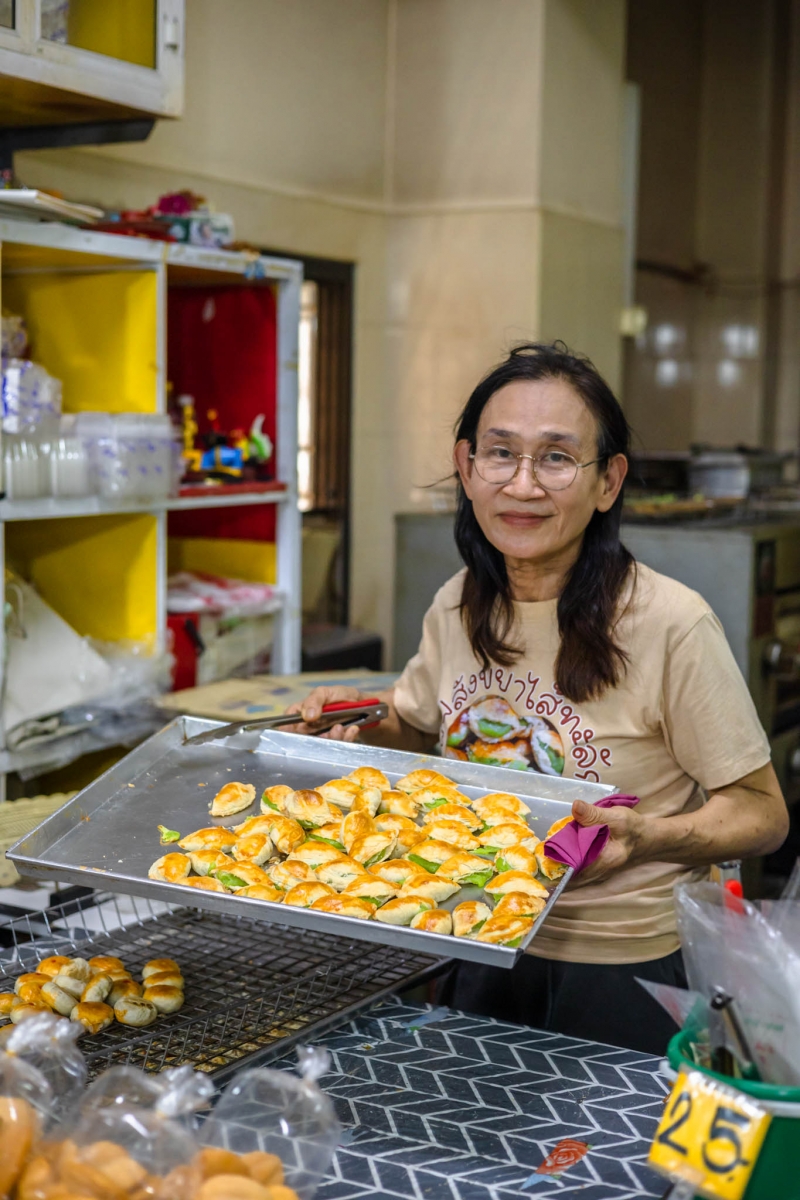 ทุกวันนี้ทางร้านเรามีขนมอะไรบ้าง กี่ใส้ - ก็จะมีขนมไข่ ขนมไข่กรอบ พัฟสังขยา ใส้เค็ม และใส้สัปปะรด แต่ใส้ที่ขายดีสุดๆจะมีใส้สังขยายที่ลูกค้ามาซื้อเยอะมาก ทำไม่เท่าไหร่ก็ขายหมด บางทีไม่ทันได้วางลูกค้าก็โทรมาจองแล้ว หรือพอมาหน้าร้านก็จะเอาเลย เราก็จะบอกไปว่ากี่นาทีรอได้ไหม โชคดีที่ลูกค้าบอกรอได้ บางคนสั่งไว้ไปเดินล่นแล้วกลับมาเอา บางรายมาจากกทม.มาถึงนี่อยากจะกินก็เดินตามหาถามๆ คนแถวนี้ ซื้อกินก่อน 1 ถุง ก่อนจะกลับก็มาแวะอีก 1 รอบ ซื้อติดไม้ติดมือกลับไปฝากญาติๆ อาจจะกลายเป็นของฝากไปแล้วช่วงนี้