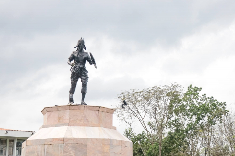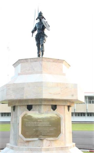 รูปแบบของอนุสาวรีย์เป็นรูปปั้นนักรบไทยโบราณ หล่อด้วยทองแดงรมดำ สูงประมาณ 165 ซม. ในท่ายืน มือขวาถือดาบ มือซ้ายถือโล่ป้องกันตัว