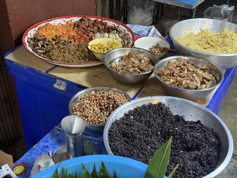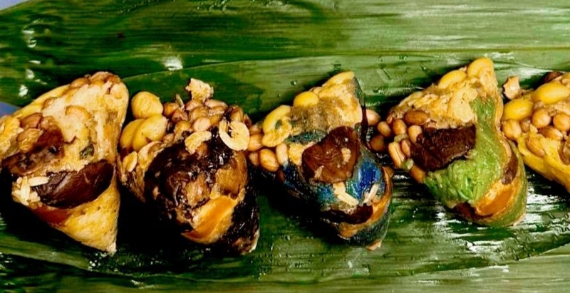 -ส่วนข้าวที่ผัด ก็ผัดพออกสีสวยๆ ที่เห้นคือใส่ถั่วลงไปผัดในตัวข้าวนั้นคือเวลาเรากินเรากัดตรงไหนก็จะเจอถั่ว แล้วข้างบนเราก็โปะด้วยถั่วอีกครั้งก่อนปิดมัด