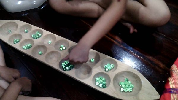 - ถ้าหมากเม็ดสุดท้ายตกตรงหลุมที่มีหมากอื่นเหลืออยู่ ให้หมากทั้งหมดในหลุมนั้นเดินต่อไปได้