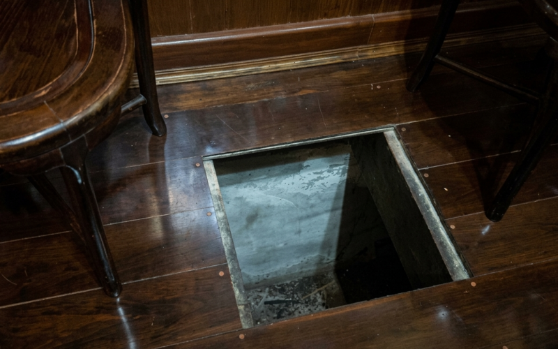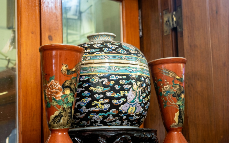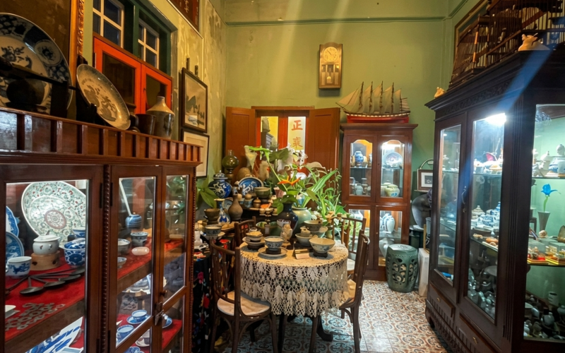 ความโดดเด่นของคาเฟ่บ้านเดือนฉายคือการอนุรักษ์โครงสร้างดั้งเดิมเอาไว้อย่างครบถ้วน ไม่ว่าจะเป็นงานไม้เก่า รายละเอียดสถาปัตยกรรม ของสะสมโบราณ หรือบรรยากาศโดยรวมที่ยังคงกลิ่นอายของวัฒนธรรมดั้งเดิมไว้อย่างชัดเจน และที่นี่พิเศษไปกว่านั้นคือ ใต้ตัวบ้านยังมี “หลุมหลบภัย” ที่สามารถใช้งานจริงและเคยได้ใช้ในช่วงสงคราม ซึ่งสะท้อนให้เห็นถึงวิถีชีวิตและสถานการณ์ในยุคนั้นได้อย่างน่าทึง