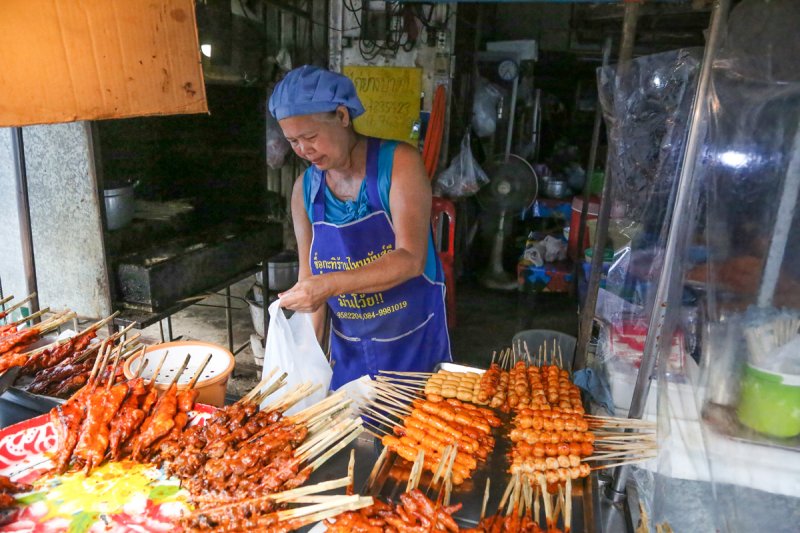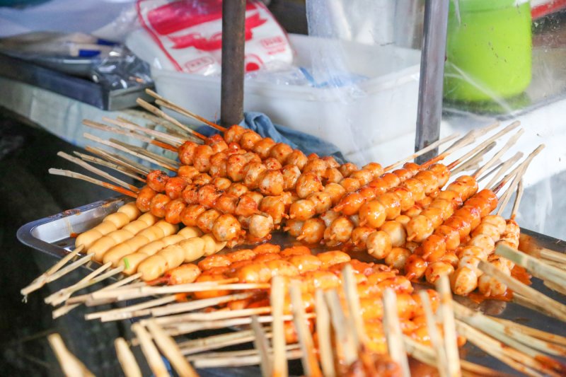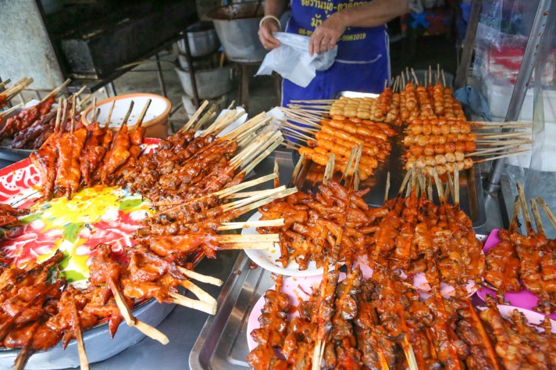 ส่วนที่เป็นเนื้อไก่นั้น ราคาก็จะแตกต่างกันออกไป เช่น ลูกชิ้น ไม้ละ 10 บาท เนื้อไก่เน้นๆ ราคาจะอยู่ที่ 25 – 30 บาท แล้วแต่ขนาด และพวกเครื่องในไก่ หรือว่าตีนไก่ คอไก่ จะอยู่ที่ไม้ละ 15 บาท ที่นี่ยังมี หมี่ผัดกะทิ ด้วยนะ ป้าตั้นบอกว่าเคล็ดลับในการผัดหมี่นั้น จะไม่ใช้น้ำมันในการผัด ป้าจะใช้หัวกะทิในการผัดเส้นและใช้พริกแห้งแดงใส่ผสมกับเส้นหมี่ปรุงรสชาติกลมกล่อมพอดีไม่หวานไม่เผ็ด หมี่กะทิจะมีเส้นด้วยกัน 2 แบบให้เลือก คือ เส้นหมี่ขาวและเส้นผัดไทย (เส้นเล็ก) หอล่ะ 20 บาท เยอะมาก ราคาถือว่าคุ้มค่ากับความอร่อย หิวเวลาไหน เช้า เที่ยง เย็น แวะมาลองกันได้นะ