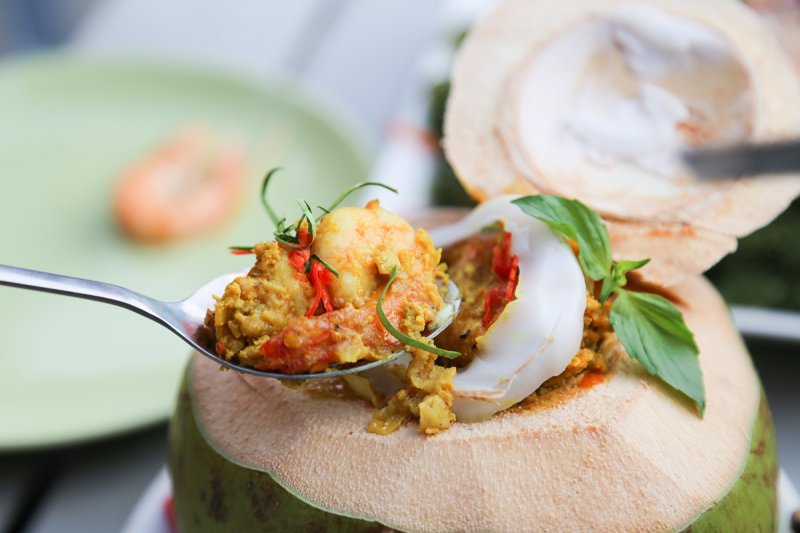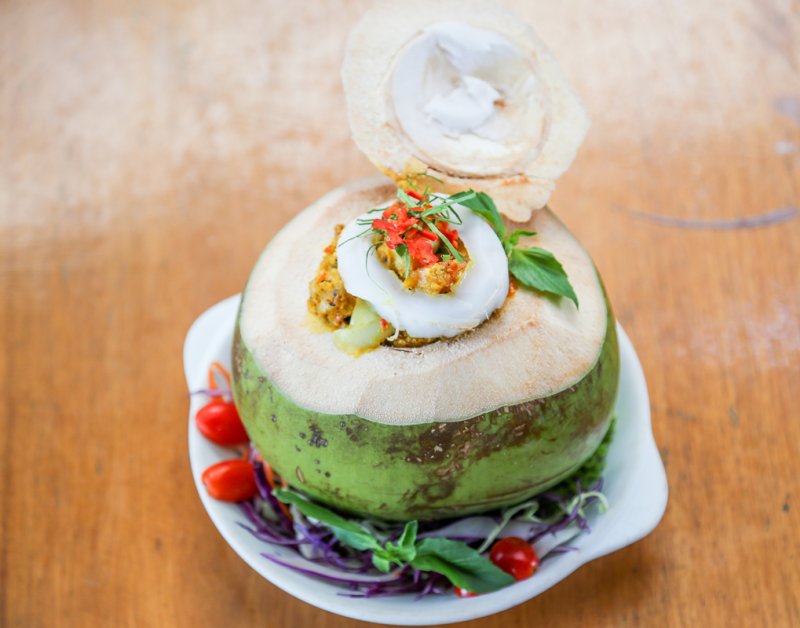 ห่อหมกทะเลมะพร้าวอ่อนเผ็ดเข้มข้นถึงรสห่อหมก ที่สำคัญได้ปลาหมึก กุ้งหมึกเต็ม ๆ มาก