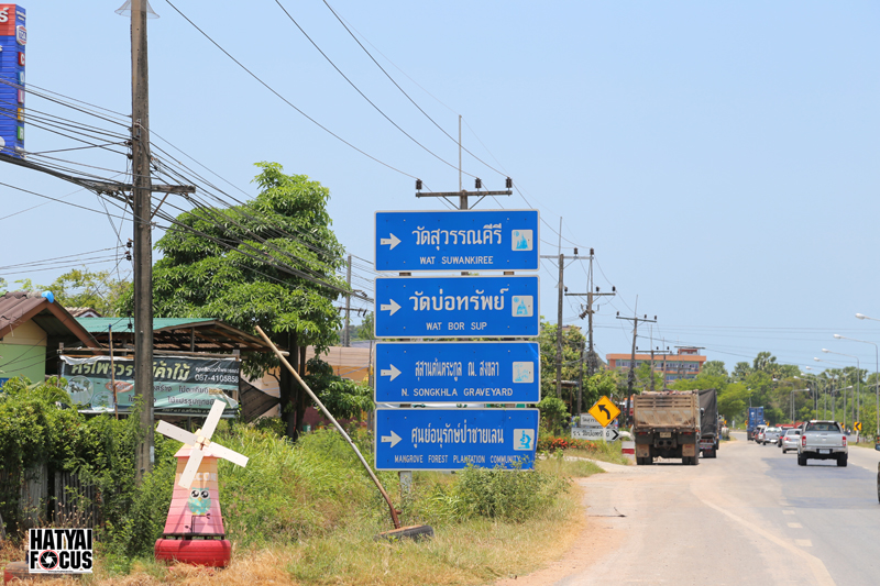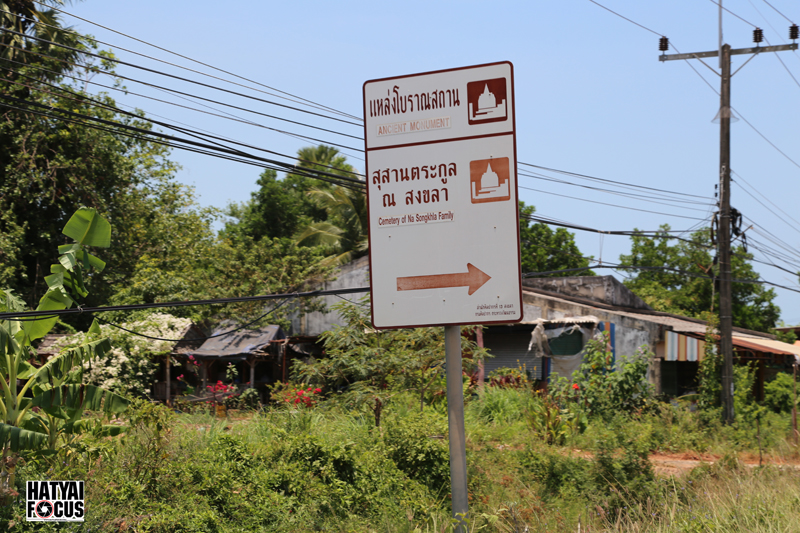 เมื่อเราลงจากสะพานติณสูลานนท์ได้ไม่นาน ก็จะเจอป้ายบอกทางไปยังสุสานตระกูลสงขลาและแหล่งโบราณสถานมากมาย (สังเกตดีๆ ป้ายอยู่ทางซ้ายมือ ทางไปอยู่ขวามือนะจ๊ะ)