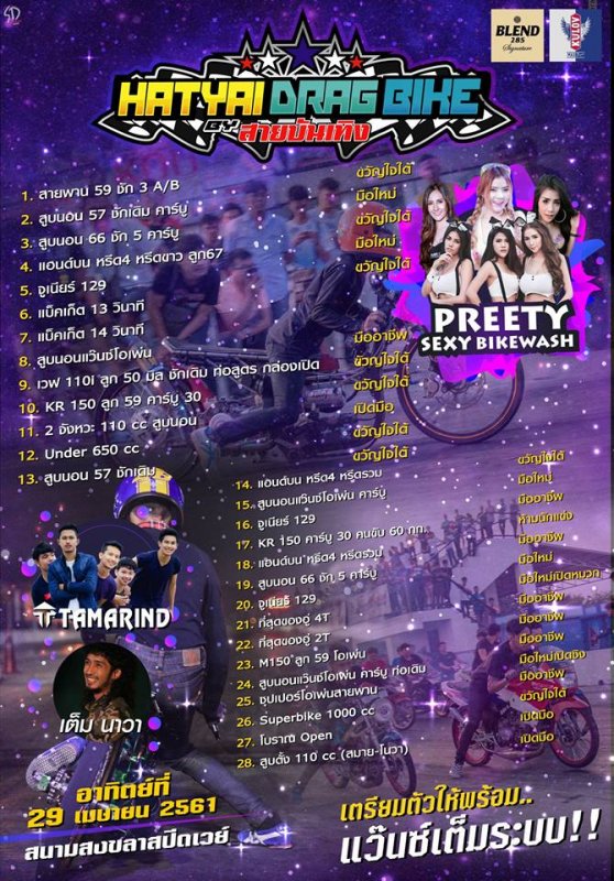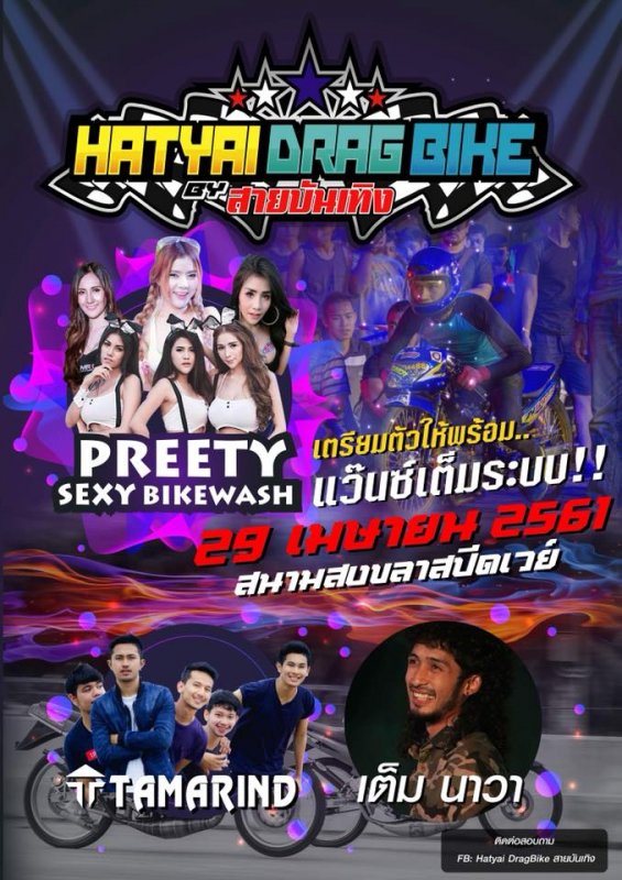 เตรียมพบกับ มหกรรมรวมตัวนักซิ่งทั่วฟ้าจังหวัดสงขลา กับเทศกาลงาน Hatyai Drag Bike By สายบันเทิง อันเป็นมหกรรมสำหรับผู้ที่มีใจรักในความเร็วบนท้องถนน มาร่วมแข่งขันชิงชัยกัน ณ สนามสงขลาสปีดเวย์ อย่างถูกต้องตามกฏหมาย เตรียมตัวรับชม บรรดาพริตตี้สาวสวยโชว์ล้างรถมอไซค์สุดสยิว Pretty Sexy Bikewash และรับชมมินิคอนเสิร์ตจาก "เต็ม นาวา" และ "TAMARIND" พร้อมรับการแข่งขันสุดมันส์ งานจัดวันที่ 29 เมษายน 2561