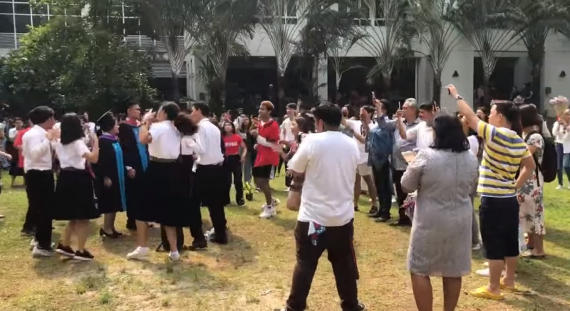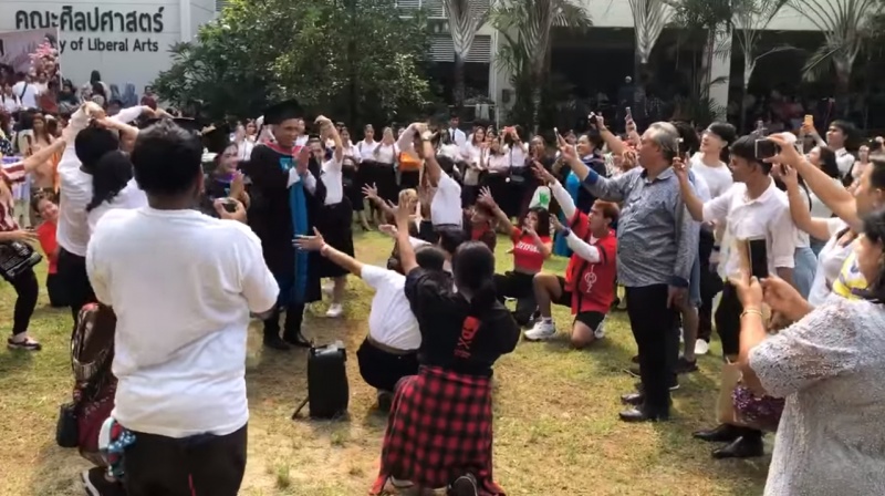 โดยเป็นคลิปที่ถูกบันทึกไว้ เมื่อวันที่ 07 ก.ย.62 ภายในคณะศิลปศาสตร์ ซึ่งแรก ๆ บรรยากาศยังดูเป็นการแสดงความดีใจ จากน้อง ๆ และญาติ เหมือนงานรับปริญญาแบบปกติ มีนักศึกษารุ่นน้องของคณะได้ร่วมร้องเพลงบูมให้กับรุ่นพี่ที่มารับปริญญา