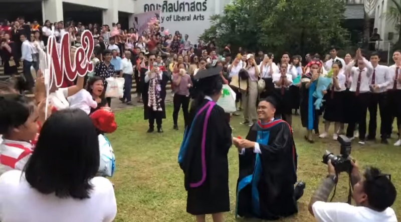 แต่เมื่อจนจะถึงท้ายคลิป พบว่าบัณฑิตชาย(ปริญญาโท คณะศิลปศาสตร์) ได้คุกเข่าขอบัณฑิตหญิง ซึ่งได้จบจากคณะวิทยาการจัดการ ปริญญาโทเช่นเดียวกัน แต่งงาน โดยมีบัณฑิต ญาติ ๆ ตลอดคณาจารย์นักศึกษาปัจจุบันร่วมแสดงความยินดีเป็นจำนวนมาก