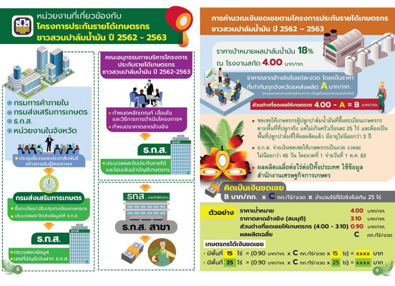 3.โครงการประกันรายได้เกษตรกรชาวสวนปาล์มน้ำมัน ปี 2562-2563 ช่วยเหลือครัวเรือนละไม่เกิน 25 ไร่ (ปาล์มน้ำมันอายุไม่น้อยกว่า 3 ปี) ประกันรายได้ผลปาล์มทั้งทะลาย (คุณภาพน้ำมัน 18 %) ที่กิโลกรัมละ 4 บาท โดยใช้ปริมาณผลผลิตเฉลี่ย 2,906 กิโลกรัม/ไร่/ปี (ข้อมูลย้อนหลัง 3 ปี ของ สศก.ใช้เท่ากันทุกจังหวัด) เริ่มโครงการ สิงหาคม 2562 – 30 กันยายน 2563