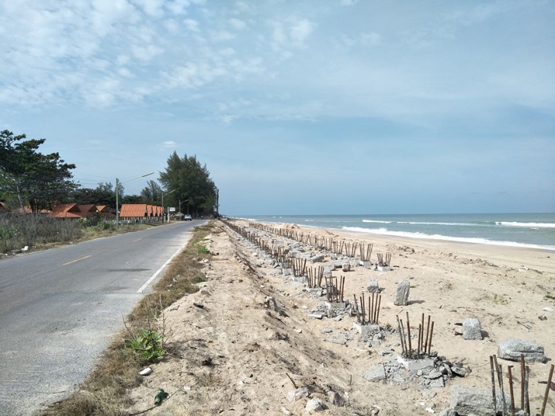 ชายหาดแห่งนี้เคยมีการสร้างกำแพงกันดินเพื่อปรับภูมิทัศน์ไปแล้วหนึ่งครั้ง ซึ่งปัจจุบันกำแพงนั้นได้ถูกพืชชายหาดปกคลุมจนเกือบมิด นั่นย่อมแสดงให้เห็นว่า ชายหาดแห่งนี้ค่อนข้างเสถียร แทบไม่มีการเปลี่ยนแปลงเชิงกายภาพใด ๆ แม้ช่วงที่เกิดพายุซัดฝั่งอย่างพายุปาบึกเมื่อเดือนมกราคม 2562 จากการลงพื้นที่สำรวจก็ไม่ปรากฏร่องรอยของการกัดเซาะชายฝั่ง มีเพียงทรายที่ถูกคลื่นซัดขึ้นมาบนถนนและน้ำที่กระเซ็นข้ามมาด้านในเพียงเล็กน้อยเท่านั้น พร้อมทั้งเริ่มเห็นเสาเข็มจำนวนมากมาวางริมชายหาด มีการปักหมุดเขตการก่อสร้าง อะไรซักอย่าง คาดเดาได้ว่าน่าจะเป็นกำแพงกันคลื่นที่จะวางตัวอยู่บนชายหาดอย่างแน่นอน เราจะสร้างกำแพงทับลงไปบนชายหาดที่สมบูรณ์แบบนี้หรือ ? เราต้องใช้โครงสร้างทางวิศวกรรมป้องกันชายหาดที่ไร้ร่องรอยการกัดเซาะด้วยหรือ ? เรามีความ "จำเป็น" ขนาดนั้นเลยหรือ?
