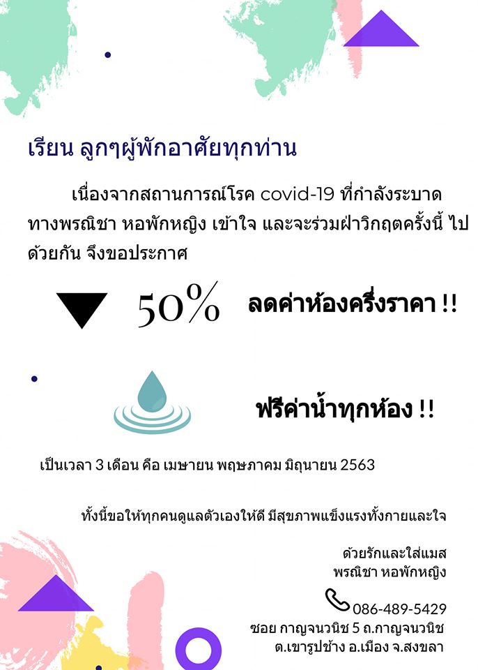วันนี้ (27/3/63) เนื่องด้วยสถานการณ์แพร่ระบากโควิด-19 มีความเพิ่มขึ้นอย่างสูง จึงทำให้เศรษฐกิจในช่วงนี้เเย่ลง ทำให้ทางเจ้าของหอพักหญิงพรณิชา อ.เมือง จ.สงขลา ได้มีการประกาศถึงผู้อาศัยทุกคน โดยระบุข้อความว่า "เนื่องจากสถานการณ์โควิด-19 ที่กำลังระบาด ทางหอพักหญิงพรณิชา เข้าใจ เเละจะร่วมฝ่าวิกฤตครั้งนี้ไปด้วยกัน จึงขอประกาศลดค่าห้องครึ่งราคา เเละฟรีค่าน้ำทุกห้อง เป็นเวลา 3 เดือน คือเดือนเมษายน พฤษภาคม มิถุนายน 2563"