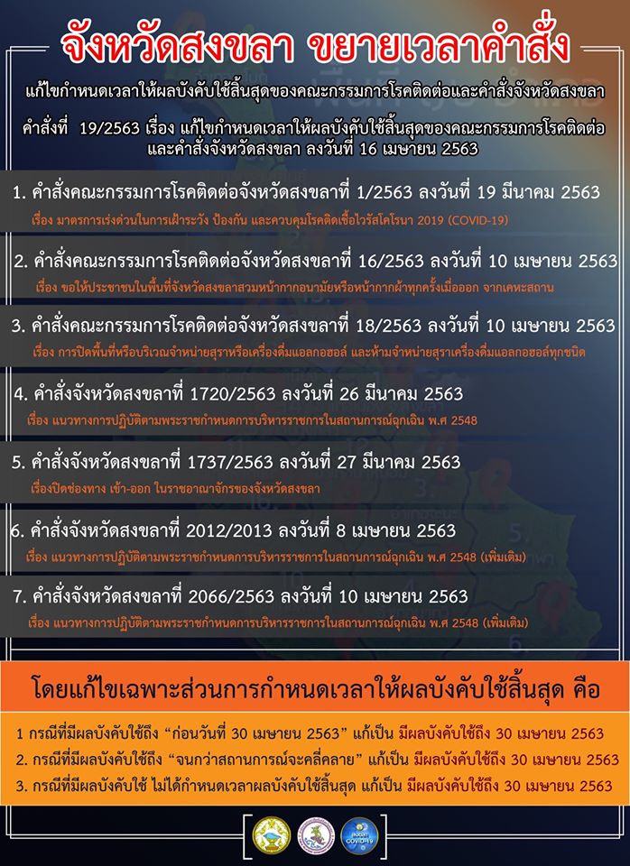 (16 เม.ย. 63) จังหวัดสงขลา ได้ประชุมคณะกรรมการโรคติดต่อจังหวัดสงขลา เพื่อพิจารณาเรื่อง แก้ไขกำหนดเวลาให้ผลบังคับใช้สิ้นสุดของคณะกรรมการโรคติดต่อและคำสั่งจังหวัดสงขลา โดยมีนายจารุวัฒน์ เกลี้ยงเกลา ผู้ว่าราชการจังหวัดสงขลา เป็นประธานการประชุม ณ ห้องประชุม CEO ศาลากลางจังหวัดสงขลา ที่ประชุมได้มีมติให้ออกคำสั่งคณะกรรมการโรคติดต่อจังหวัดสงขลา ฉบับที่ 19/2563 เรื่อง แก้ไขกำหนดเวลาให้ผลบังคับใช้สิ้นสุดของคณะกรรมการโรคติดต่อและคำสั่งจังหวัดสงขลา นับตั้งแต่บัดนี้ถึงวันที่ 30 เมษายน 2563 ประกอบด้วย
