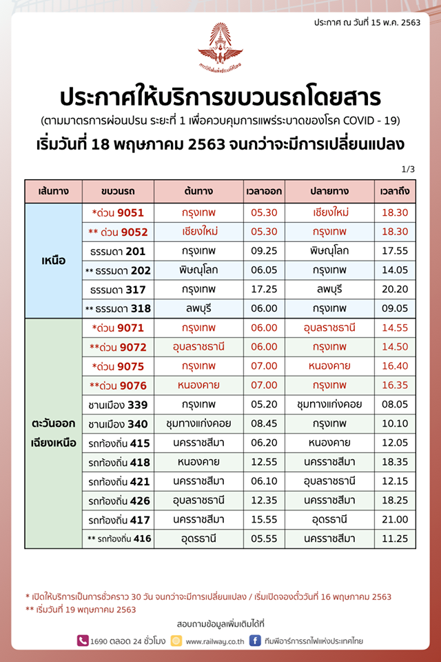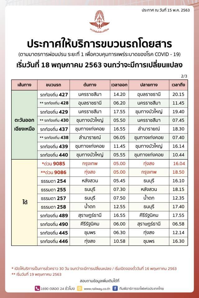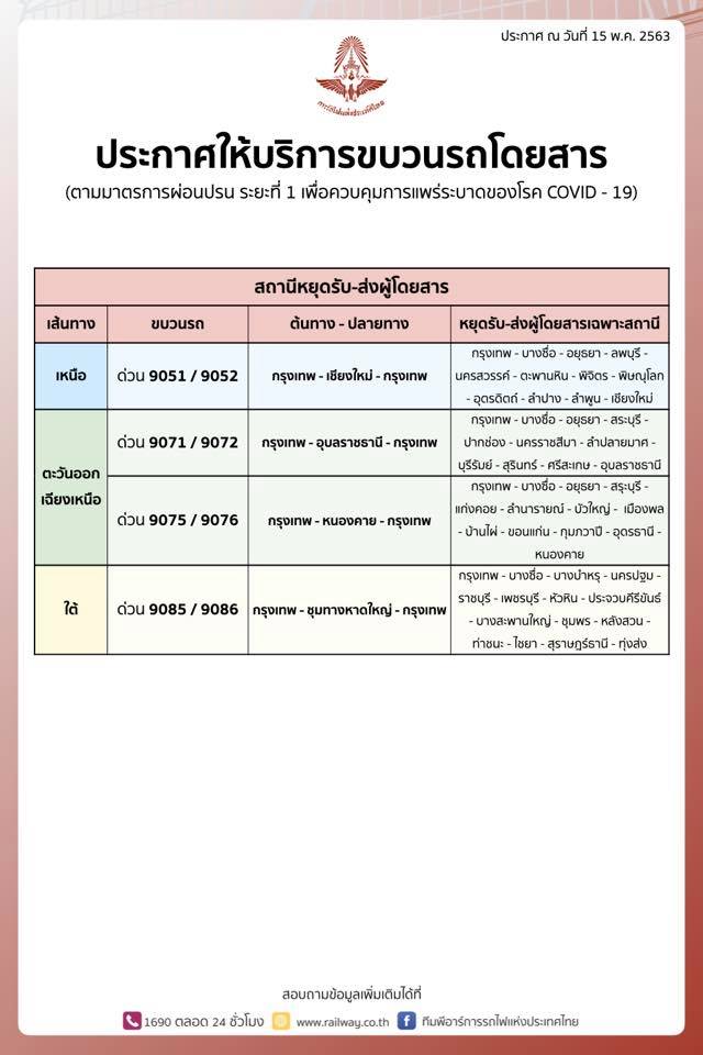 การรถไฟแห่งประเทศ ประกาศพร้อมเปิดให้บริการเดินขบวนรถโดยสารพิเศษ และขบวนรถชานเมือง ขบวนรถธรรมดาและขบวนรถท้องถิ่น หลังมีมาตรการผ่อนปรนการเดินทางให้กับประชาชน ภายใต้มาตรการป้องกันการแพร่ระบาดของเชื้อไวรัสโคโรนา 2019 (โควิด – 19) เริ่มเปิดให้บริการตั้งแต่วันที่ 18 พฤษภาคม 2563 เป็นต้นไปจนกว่าจะมีคำสั่งเปลี่ยนแปลง สำหรับผู้โดยสารที่จะเดินทางขบวนรถโดยสารพิเศษ สามารถจองล่วงก่อนเดินทางได้ตั้งแต่วันที่ 16 พฤษภาคม เป็นต้นไป